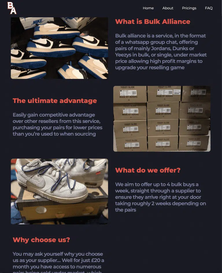 Bulk alliance is a service, in the format of a WhatsApp group chat, offering pairs of mainly Jordans, Dunks, or Yeezys in bulk, or…